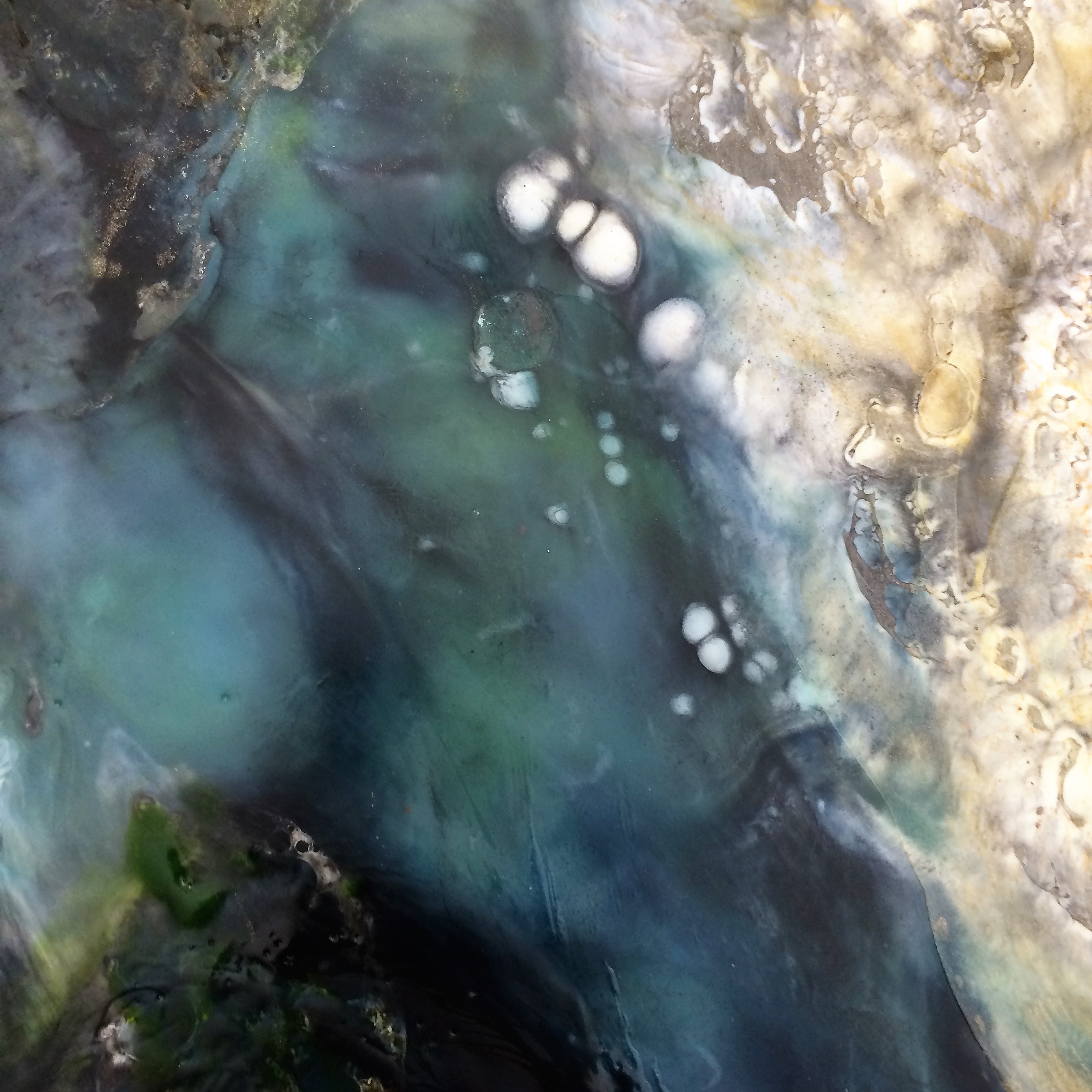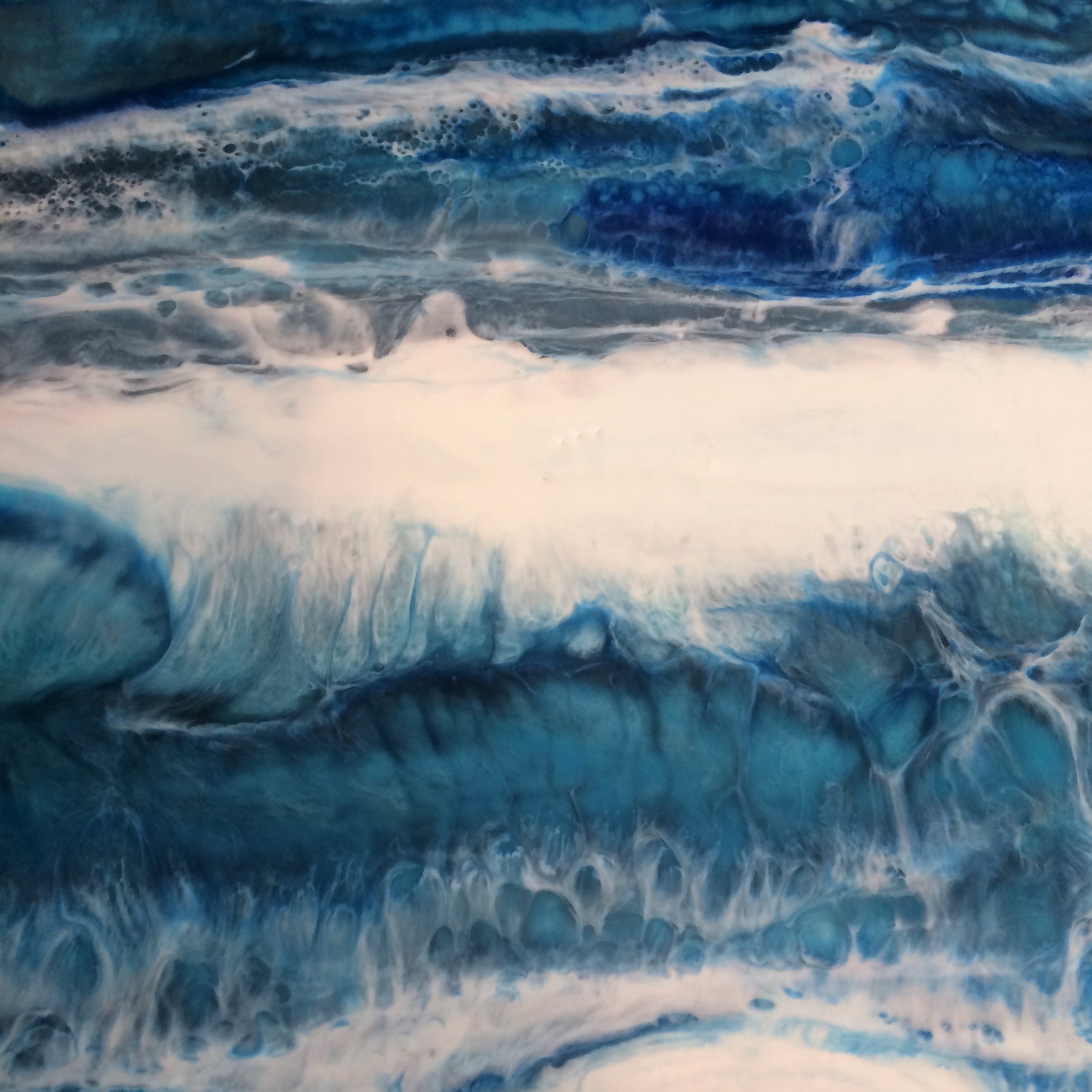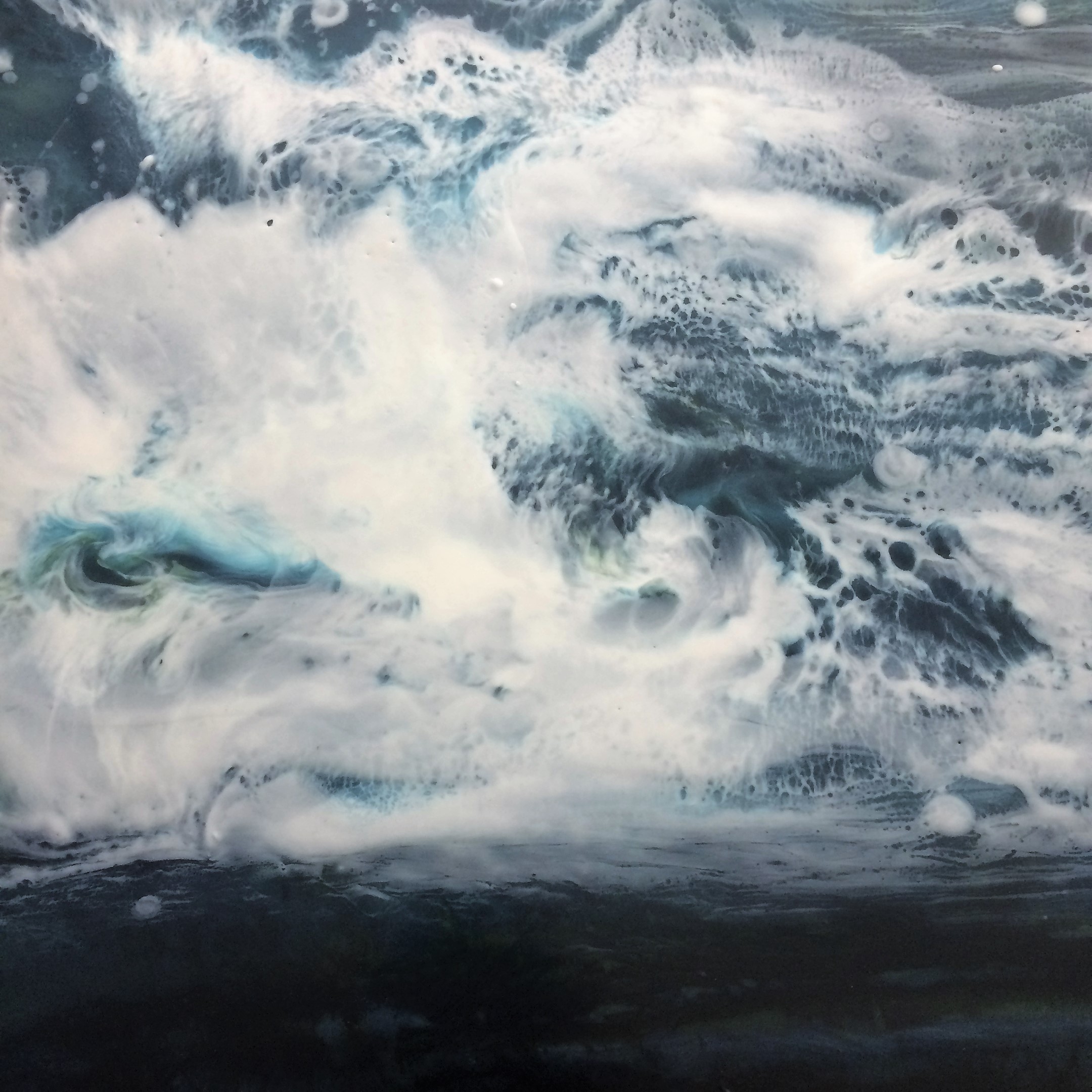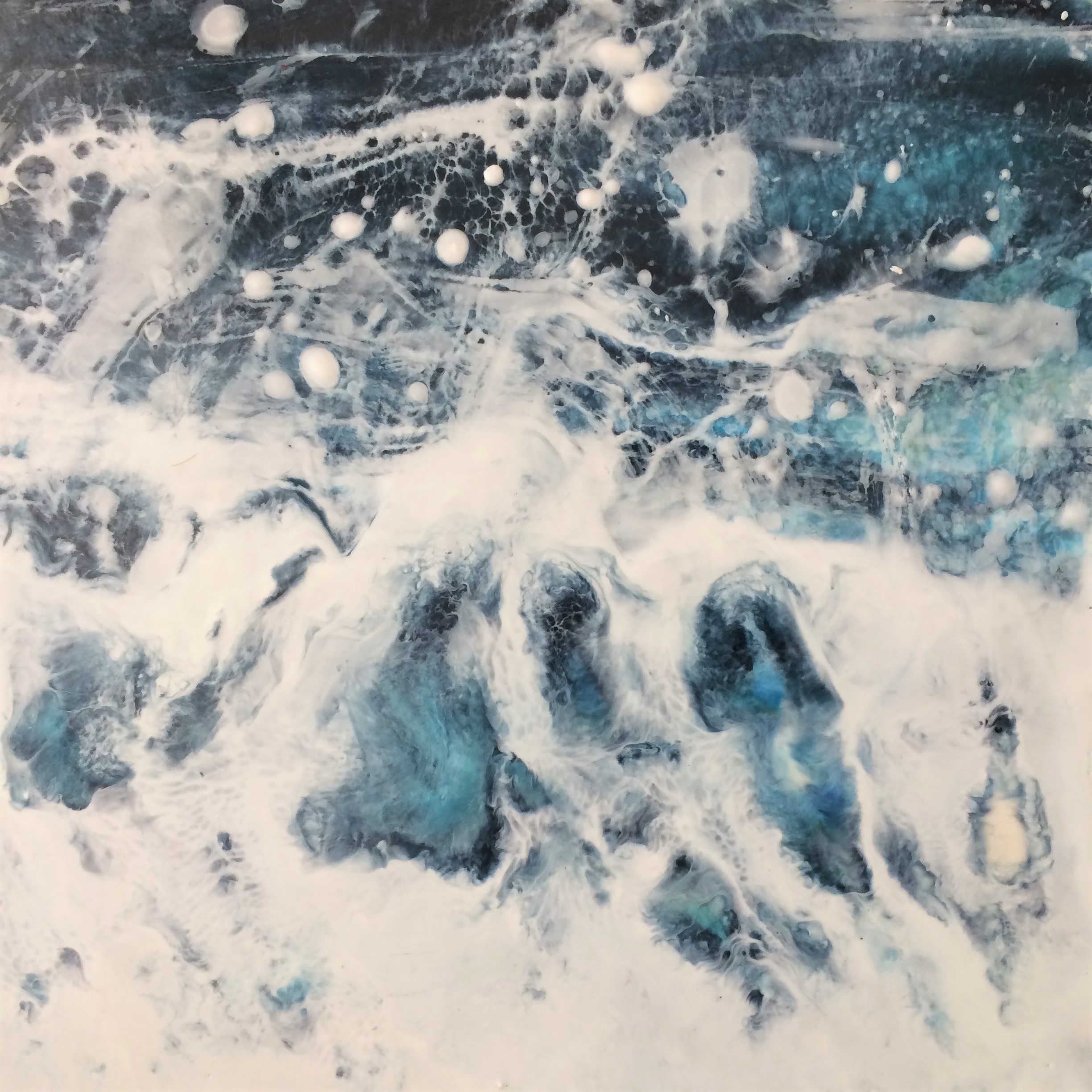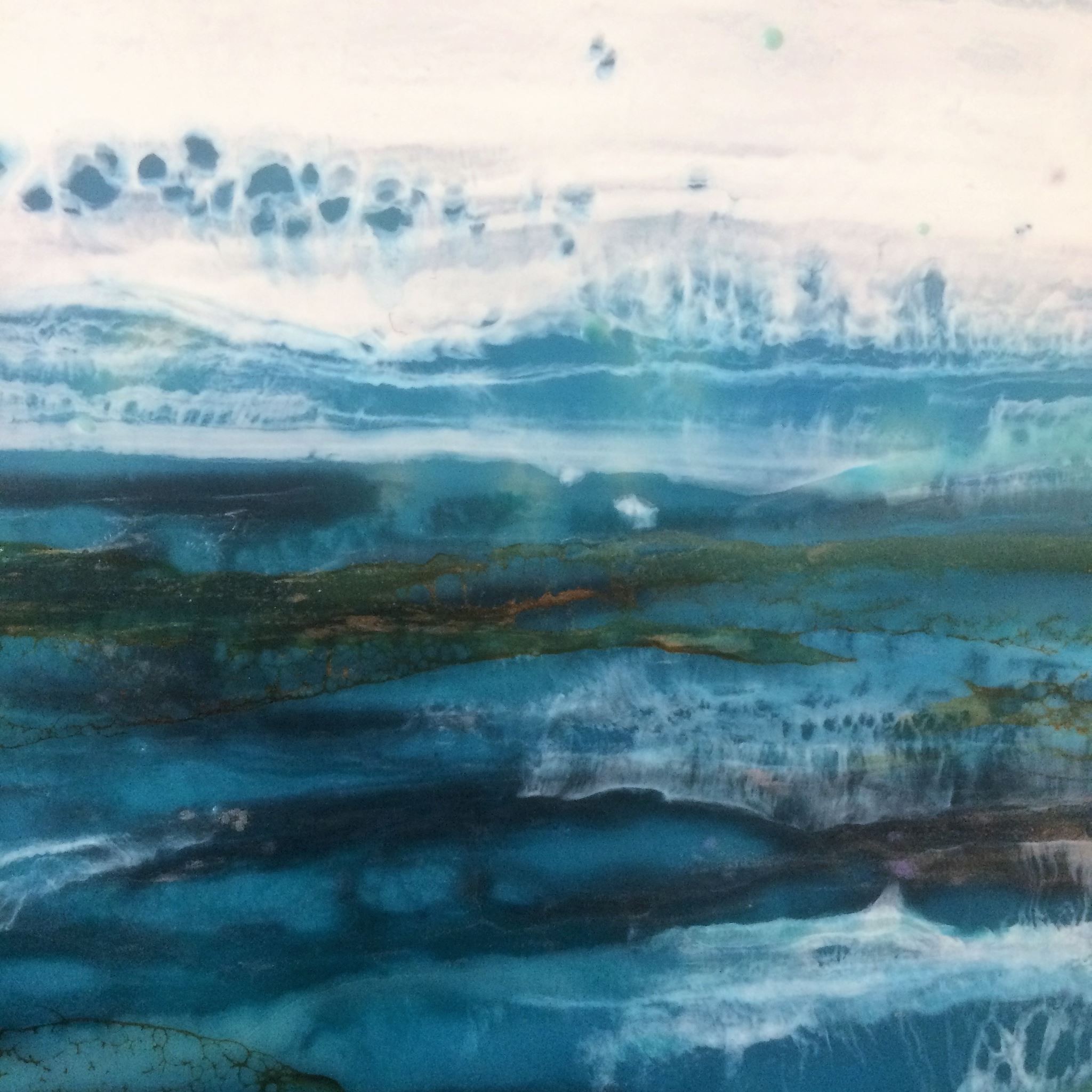 The encaustic layering process allows capturing the dynamic of flow, colours and depths emerging in unexpected ways and some of the most interesting results are achieved by simply going with the flow of the paint and seeing where it takes you.